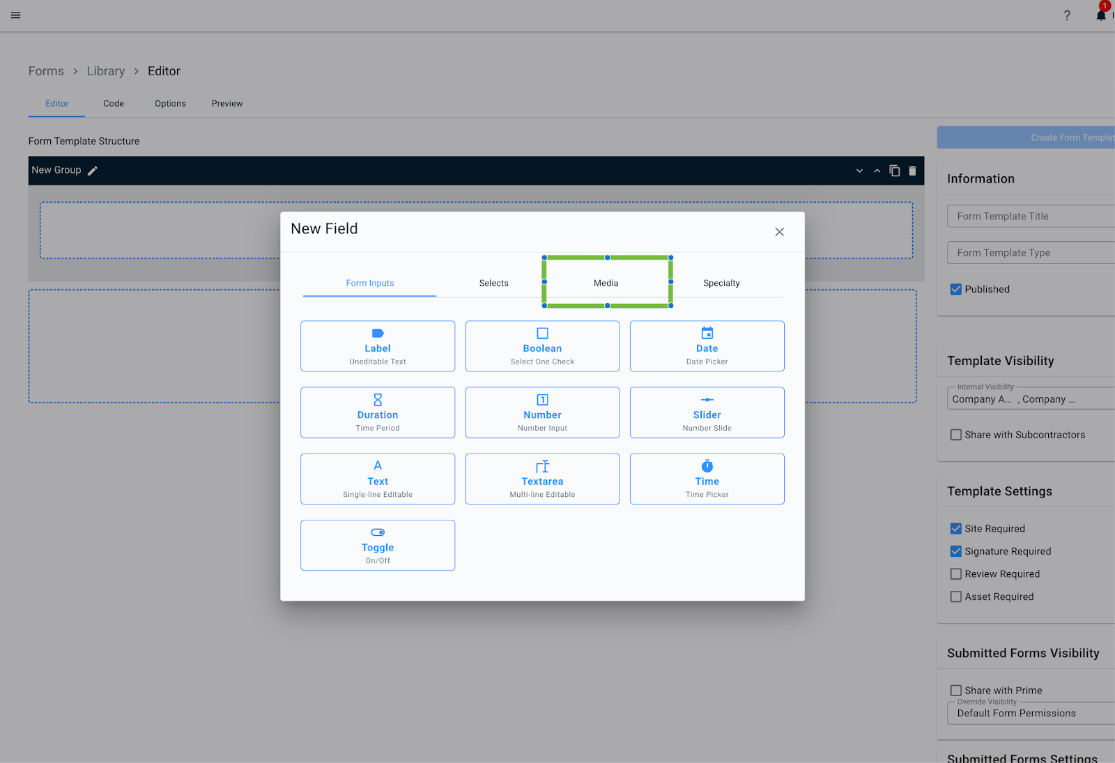 The Media tab lets you add fields that capture or display images, files, links, and signatures. These options are especially useful for field workers using mobile devices who need to document work, attach evidence, or sign off on tasks.