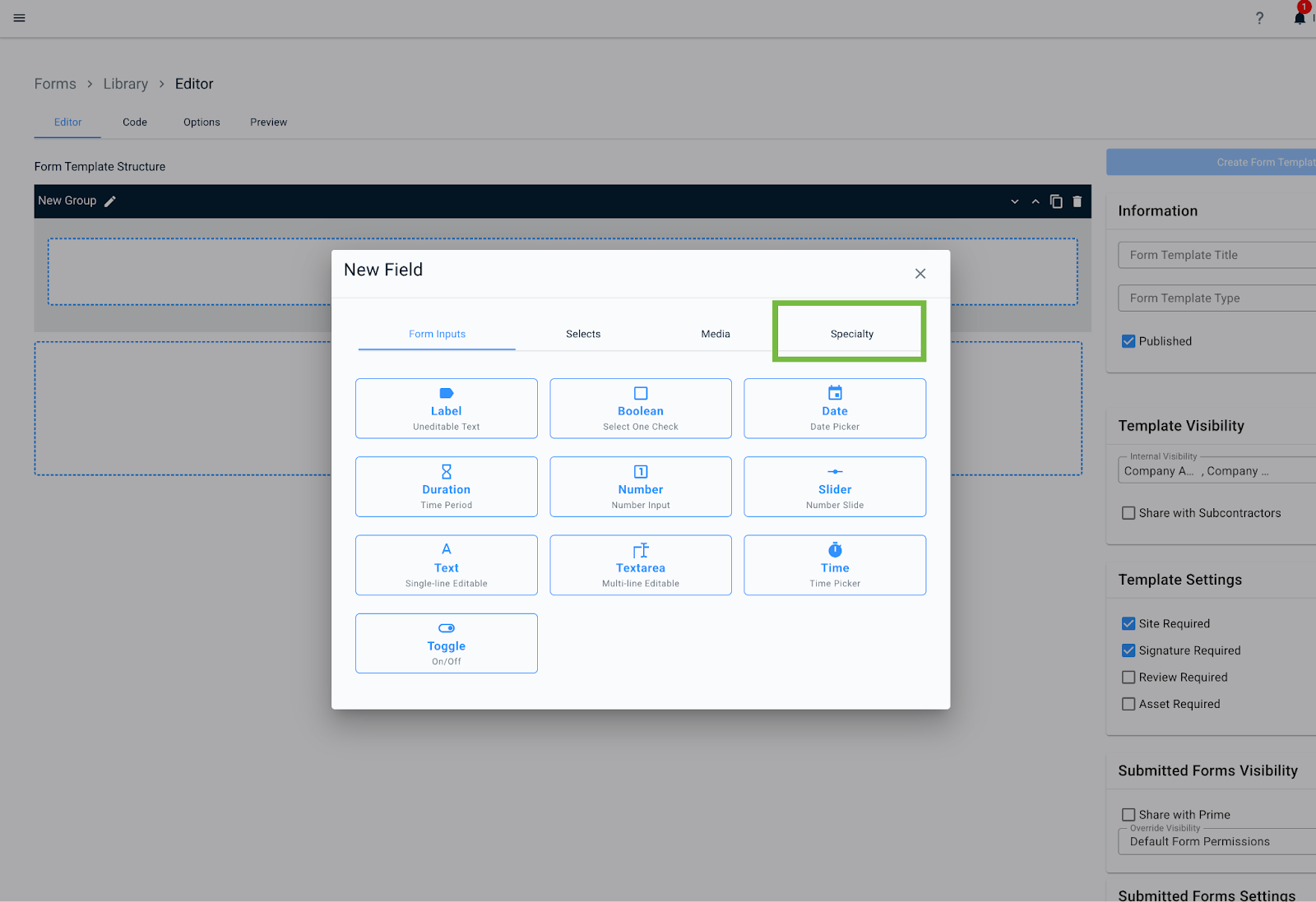 The Specialty tab includes advanced field types for calculations, repeatable sections, and structured data entry. These options help automate totals, organize complex information, and pull in known details about the end user or site.