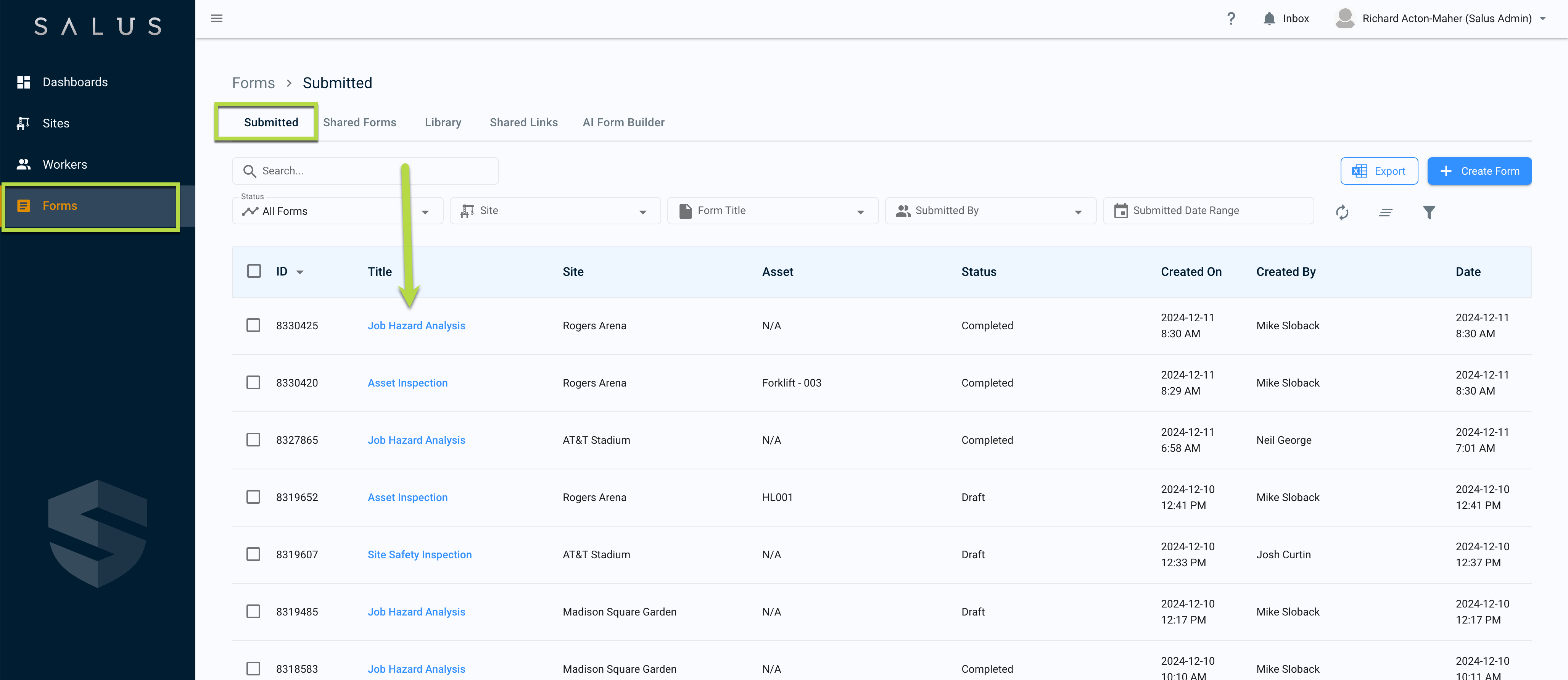 AI translations can be accessed when viewing any submitted form. From a desktop/laptop computer, log in to SALUS and click ‘Forms’ from the left-hand side navigation. From this new page, ensure you are on the ‘Submitted’ tab and click on any submitted form.