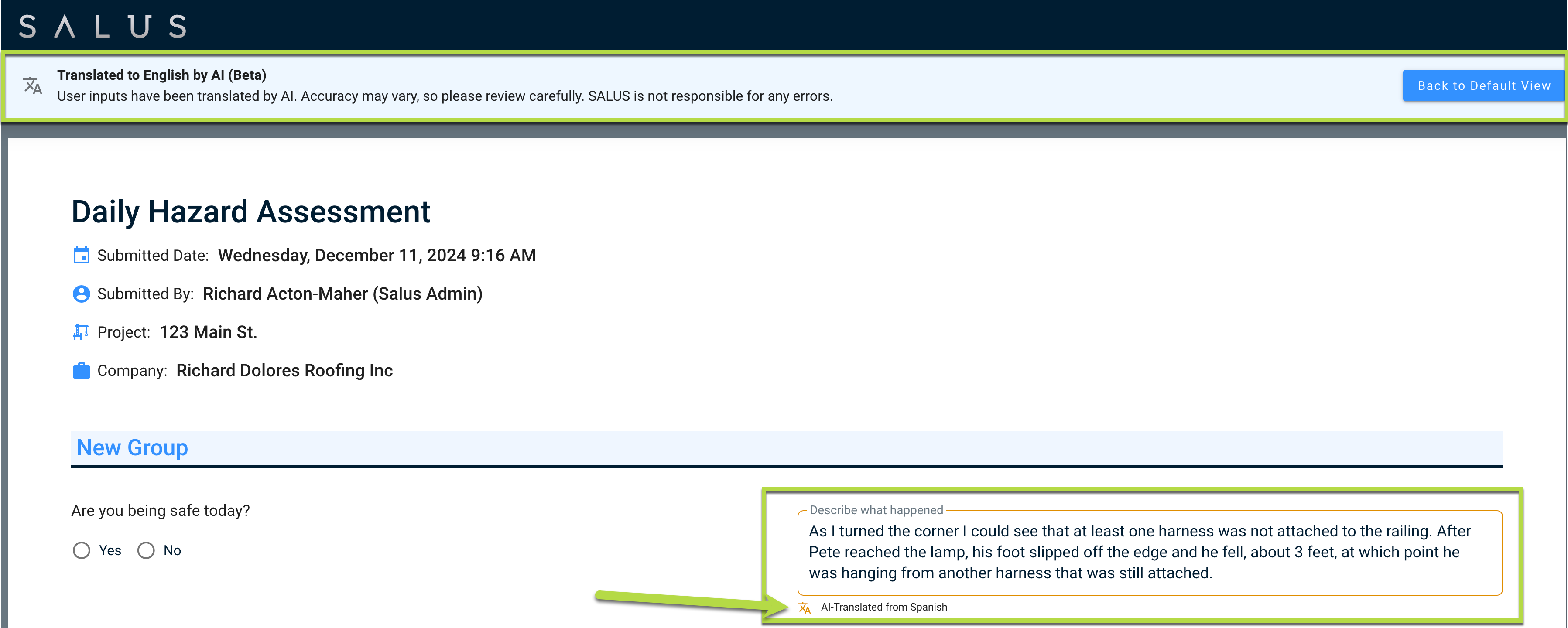 - Every field that was translated will appear with a notice that shows you that it was translated, and which language it was translated from.