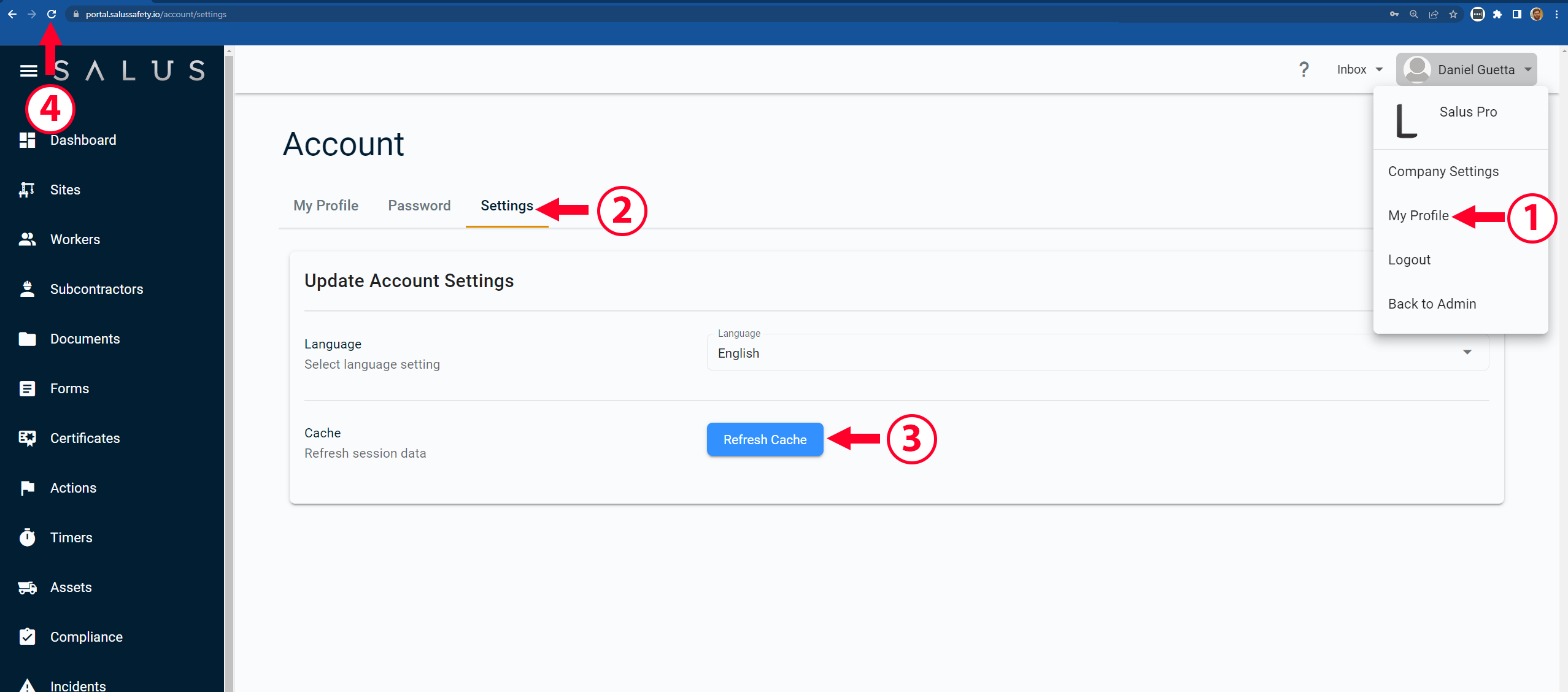 Soft Refresh: To perform a soft refresh within the Salus web app, instruct the user to go to the menu at the top right of their web app, select "My Profile," and find the refresh cache button under the settings tab. They should then reload the web page.