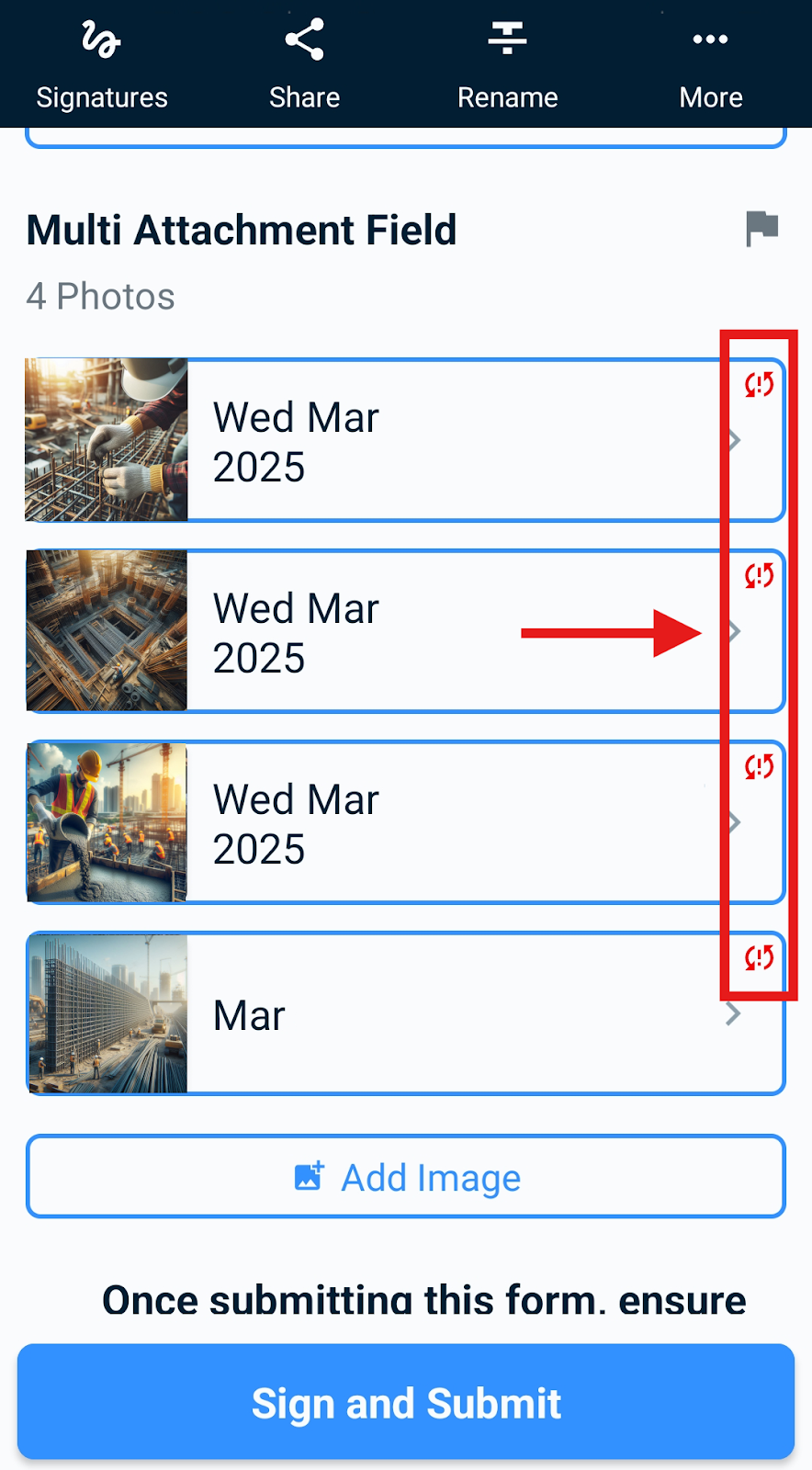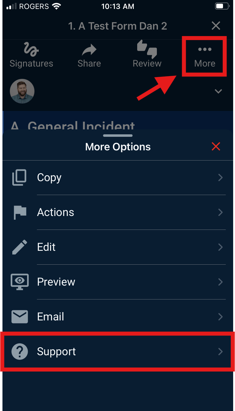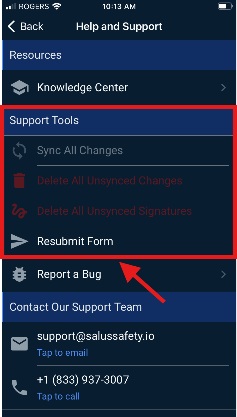 To manually attempt a resync, open the form, then navigate to More… > Support > Resubmit Form. If this option is not available, alternative syncing methods can be found under More… > Support.