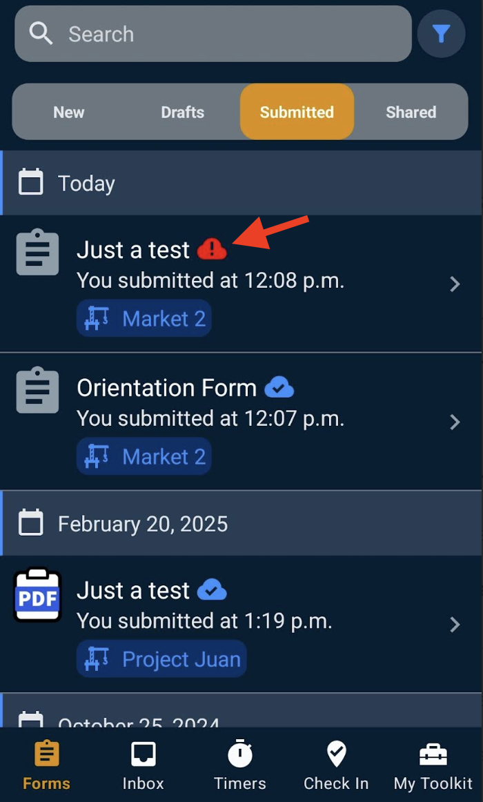 - A red circle with an exclamation mark indicates the form has not yet finished syncing with the server.