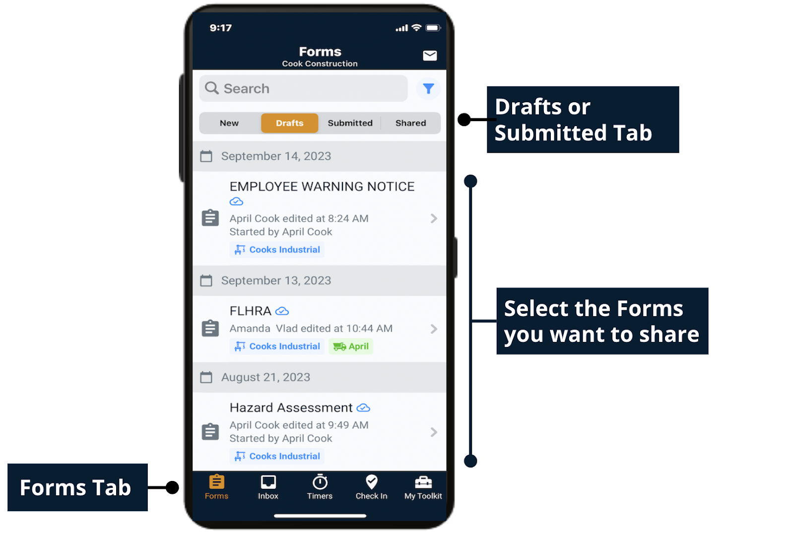 1. Click on the Forms tab and then select the Drafts or Submitted tab. Now select the forms you want to share.