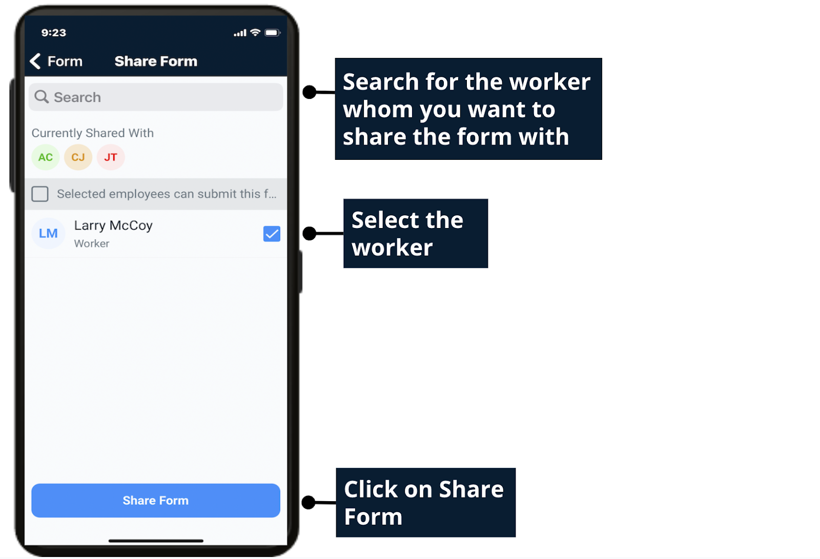 3. Search for the worker whom you want to share the form with, select the Worker and then click on Share Form.