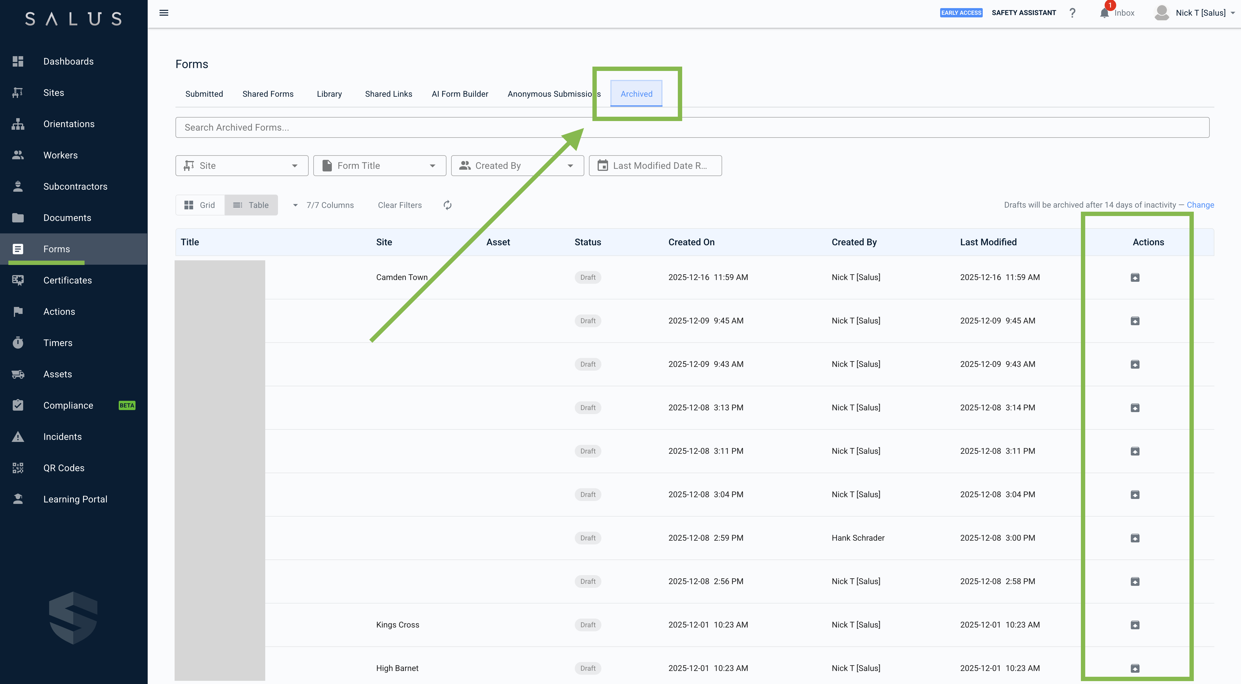 If auto-archive is set to 14 days, any draft form that has not been opened for 14 days will automatically move to the Archived tab.