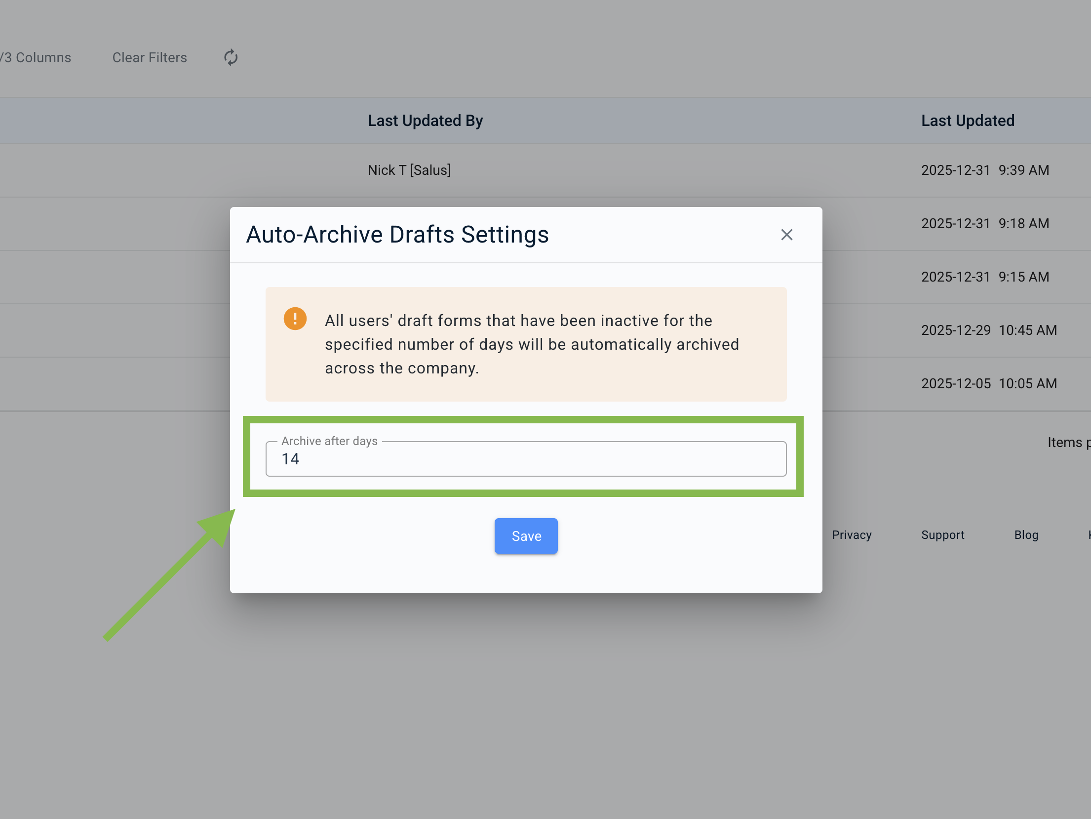 Auto-Archive Draft Forms allows company administrators to automatically move inactive draft forms into the Archived tab after a set number of days. This helps keep the Submitted Forms list clean and reduces clutter caused by abandoned or mistakenly started drafts.