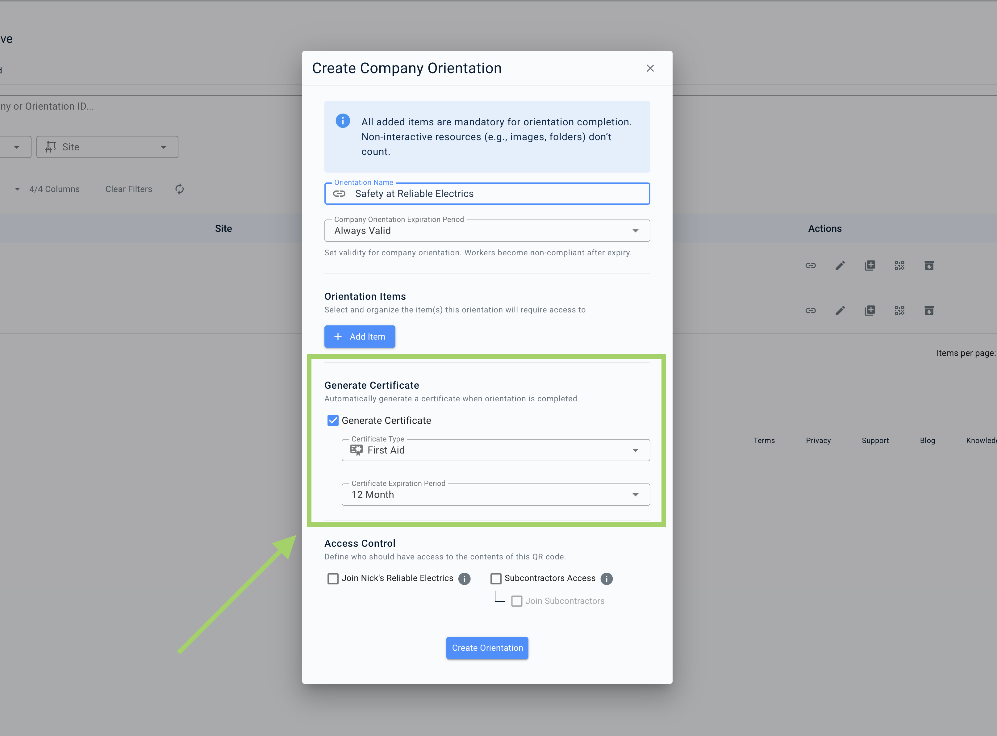 After adding your Orientation Items, you’ll see a section titled Generate Certificate.