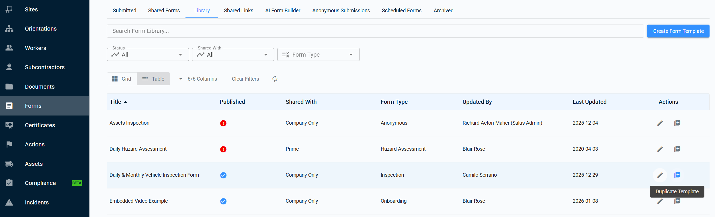 On the right side of the template row, under Actions, you will see options to edit the form or duplicate the template. - Duplicate the Template