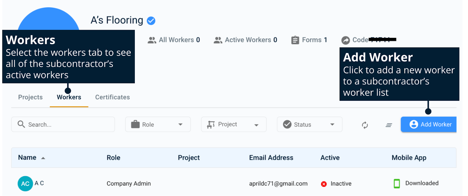 Once a subcontractor’s worker profile is in the system, you have the ability to view all of their forms and certificates from within the Workers tab by clicking on their profile.